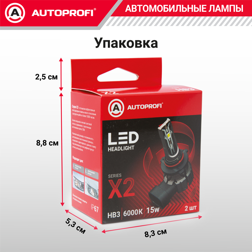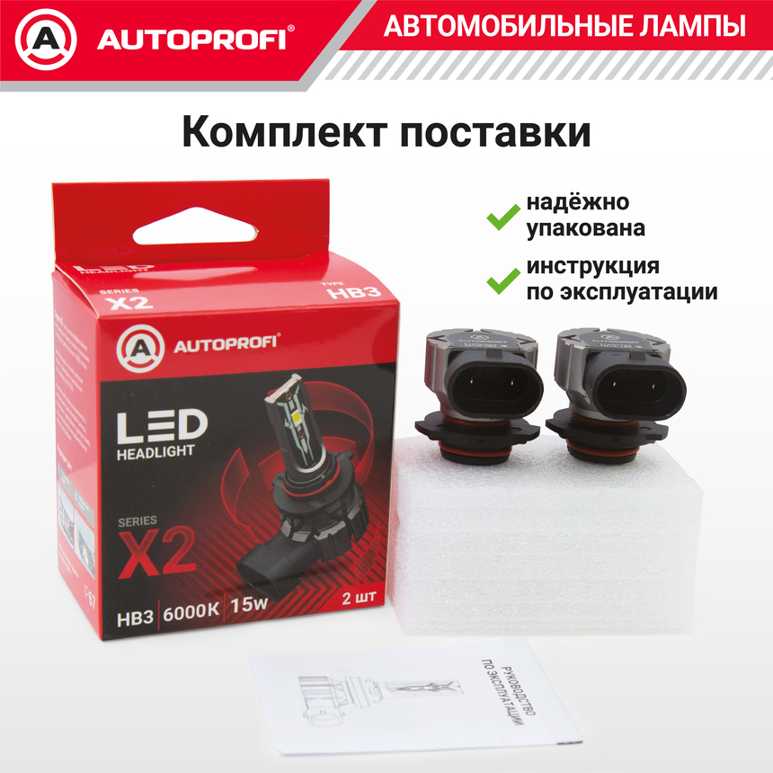 Лампа светодиодная Autoprofi, Х2 компак, HB3, 12V / 15W, 6000K, 4000 Lm, комплект 2 шт.