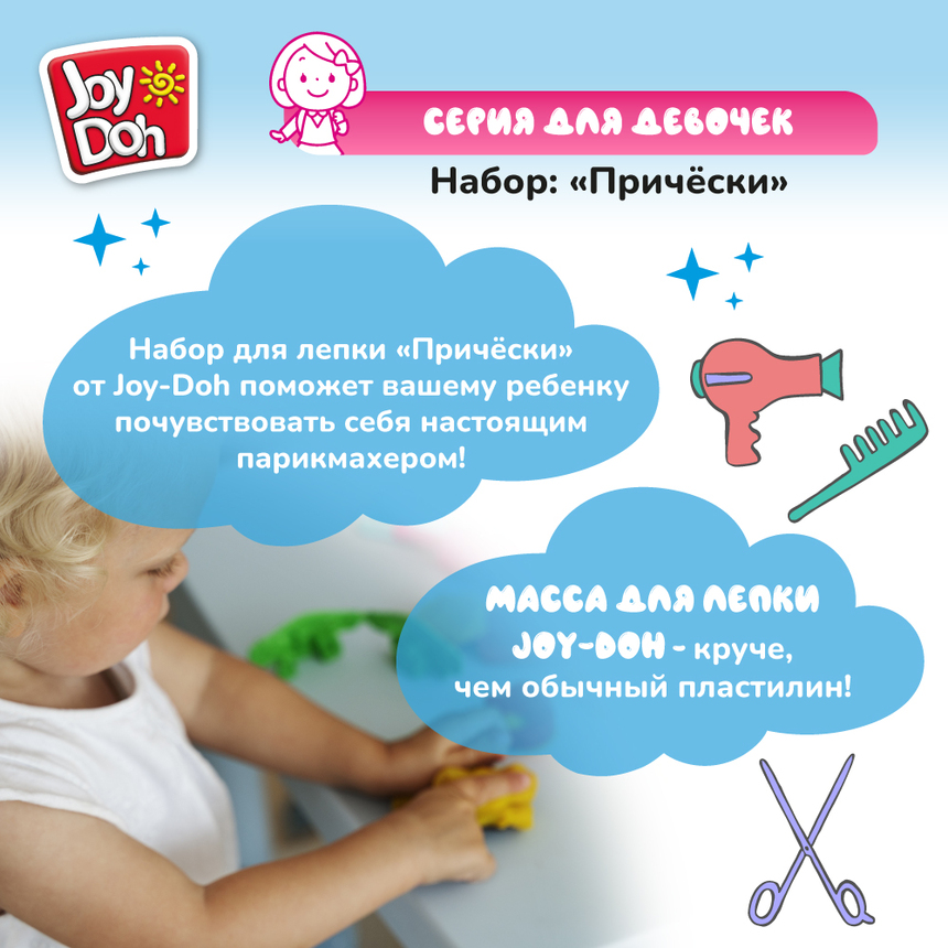 Ваш малыш постриг кота? Набор для лепки «Hair Studio» от Joy-Doh поможет вашему ребенку почувствовать себя настоящим парикмахером! В наборе есть забавные человечки с разноцветными волосами, а еще фен, расческа, и ножницы. В наборе также есть формы украшений для волос: бантики, заколки, цветочки и др. Малыш научится сам стричь волосы, заплетать косички и делать красивые прически.
