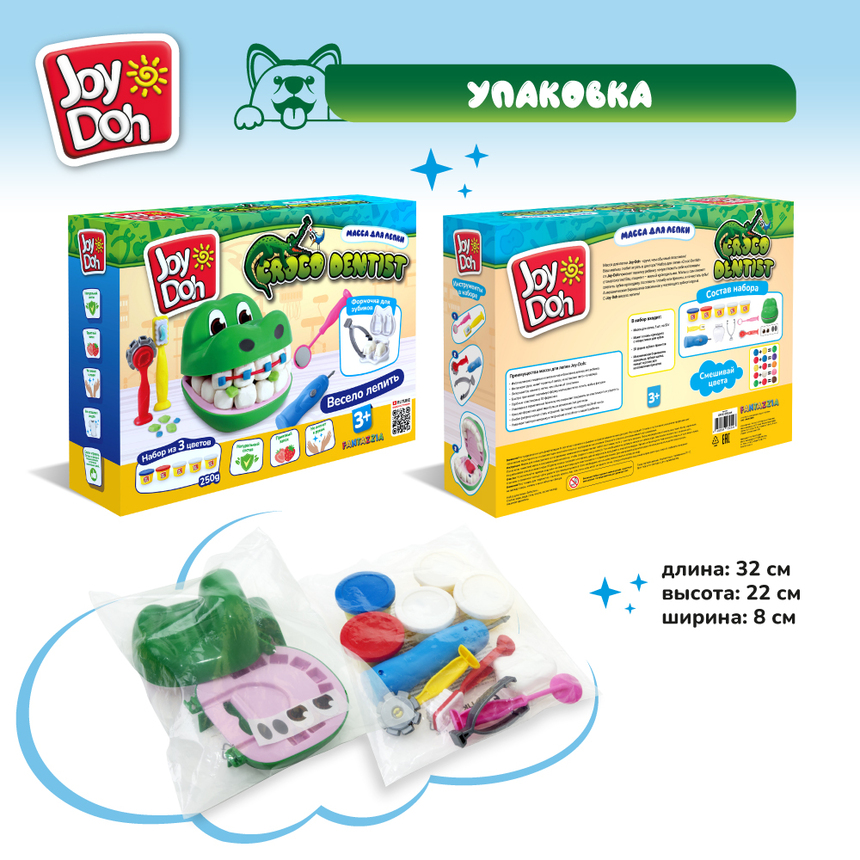 Масса для лепки Joy Doh, набор CROCO DENTIST - ЗУБАСТИК, голова крокодила, 3D формы, 8 аксессуаров, 5 баночек с тестом, (5 х 50г.)