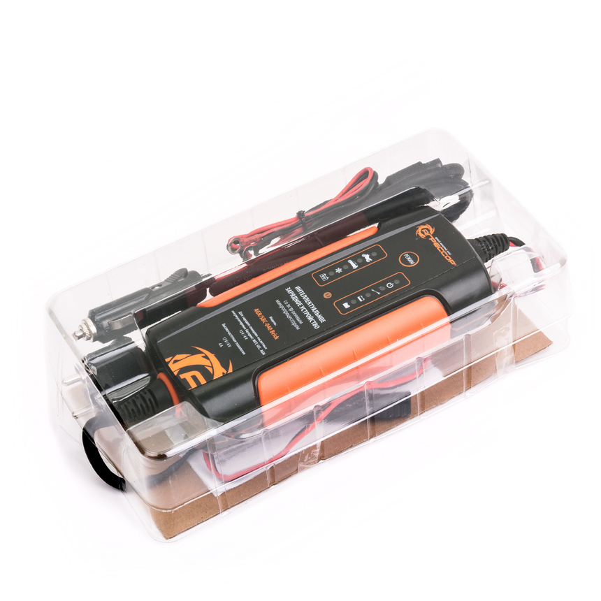 Рабочие характеристики не снижаются при низких температурах. Устройство может сколь угодно долго оставаться подключенным к аккумулятору, поддерживая требуемый заряд. Оно снащено защитой от короткого замыкания и образования искр. Зарядное устройство имеет три вида контактных клемм: зажимы, разъем для подключения к прикуривателю и кольцо (петелька).
